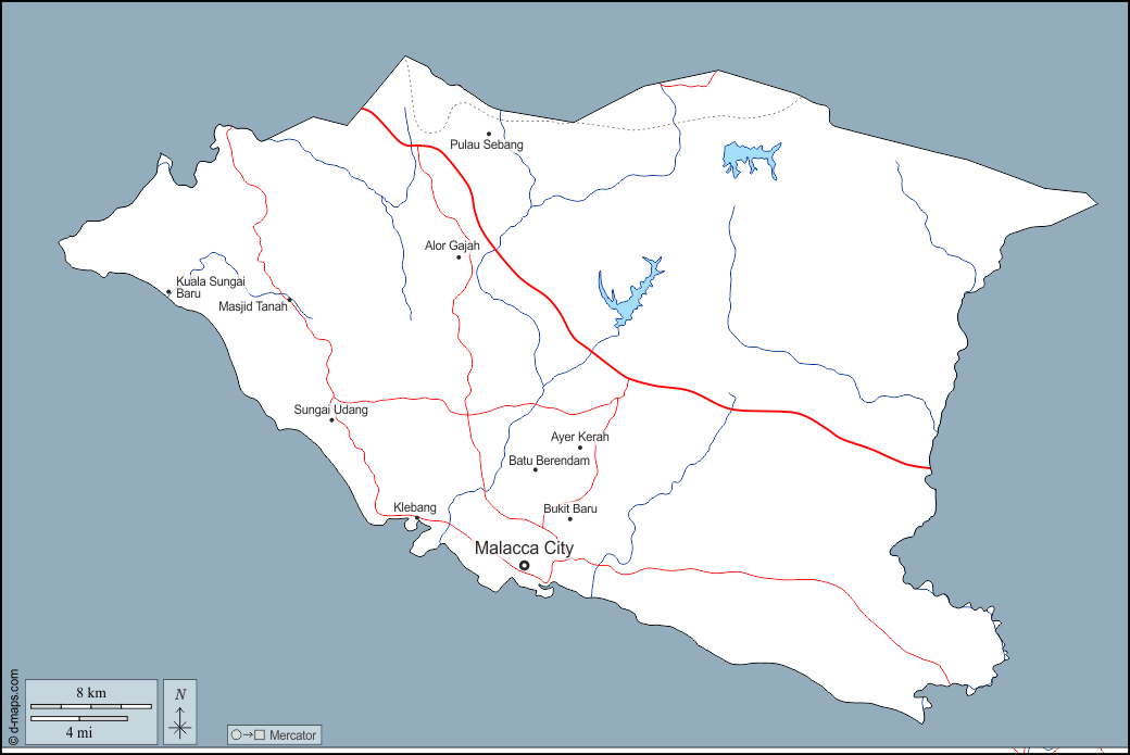d-maps > एशिया > मलेशिया > मेलाका > बाह्यरेखा, जल-सर्वेक्षण, मुख्य शहरों, सड़कों, नाम