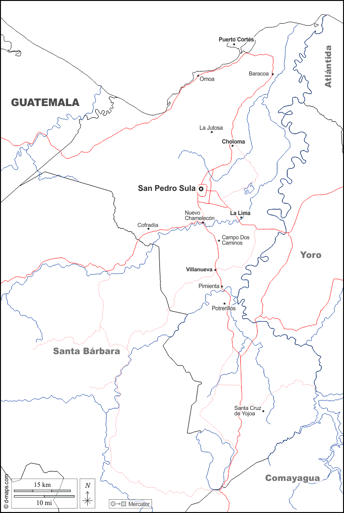 d-maps > महाअमेरिका > होंडुरास > कोर्टेस > सीमाओं, जल-सर्वेक्षण, मुख्य शहरों, सड़कों, नाम, सफेद