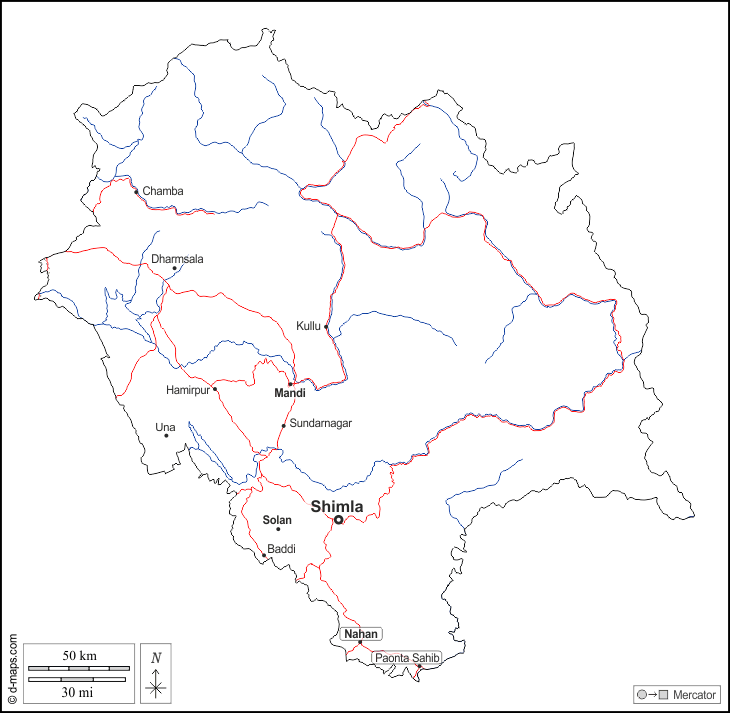 d-maps > एशिया > भारत > हिमाचल प्रदेश > बाह्यरेखा, जल-सर्वेक्षण, मुख्य शहरों, सड़कों, नाम, सफेद