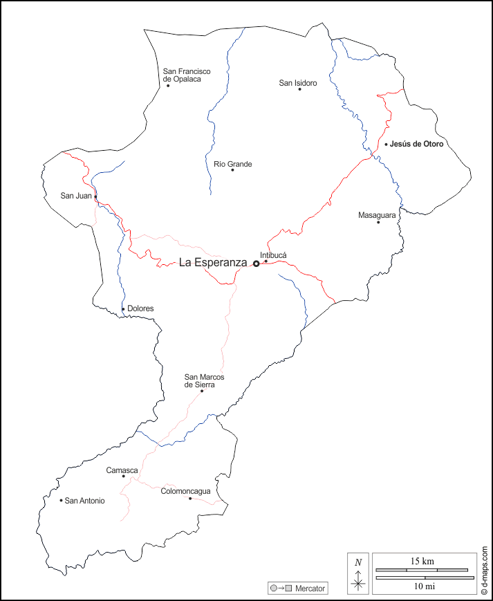 d-maps > महाअमेरिका > होंडुरास > इंतिबुका > बाह्यरेखा, जल-सर्वेक्षण, मुख्य शहरों, सड़कों, नाम, सफेद