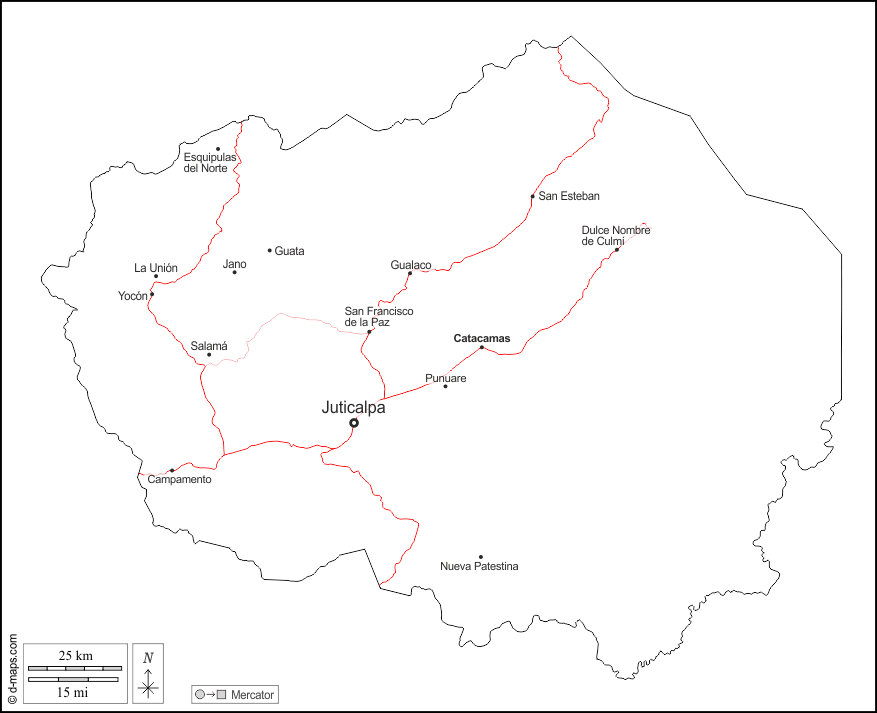 d-maps > महाअमेरिका > होंडुरास > ऑलंचो > बाह्यरेखा, मुख्य शहरों, सड़कों, नाम, सफेद