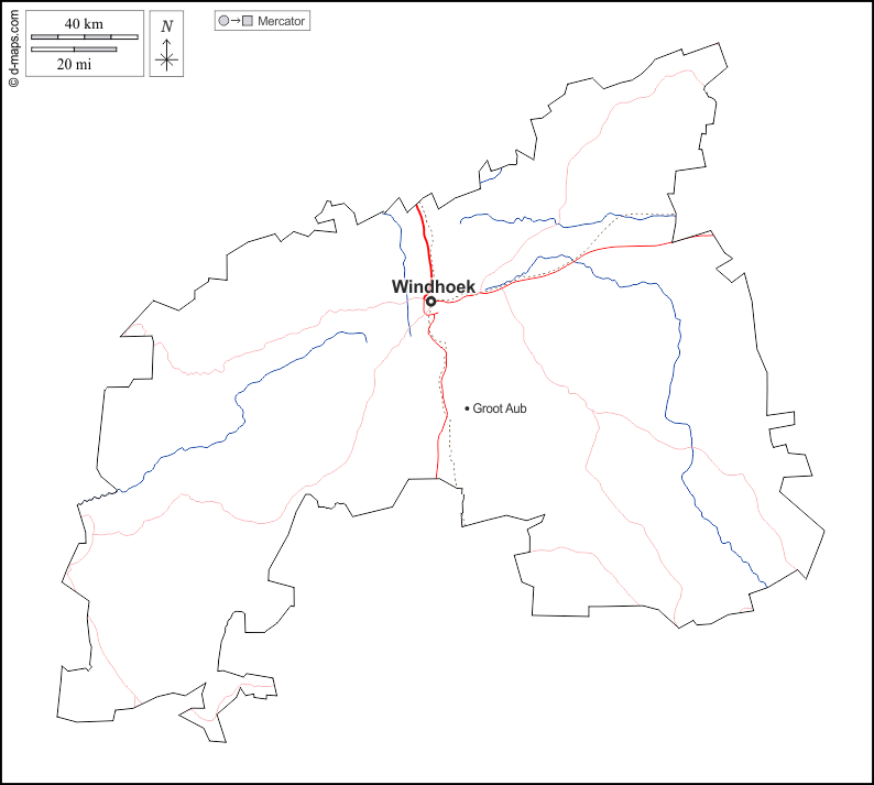 d-maps > अफ्रीका > नामीबिया > खोमास > बाह्यरेखा, जल-सर्वेक्षण, मुख्य शहरों, सड़कों, नाम, सफेद