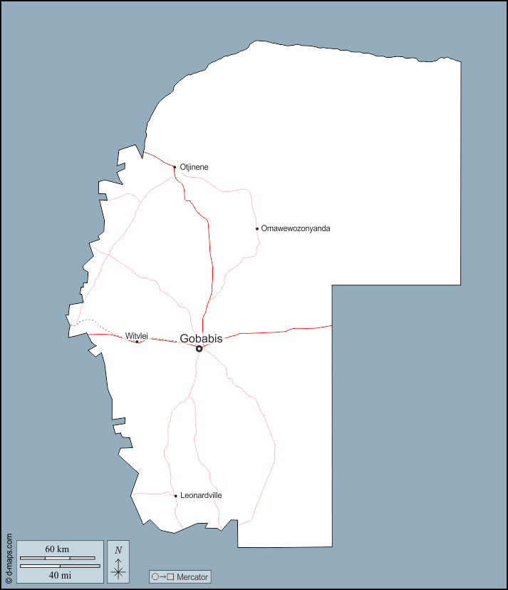 d-maps > अफ्रीका > नामीबिया > ओमाहेके > बाह्यरेखा, मुख्य शहरों, सड़कों, नाम