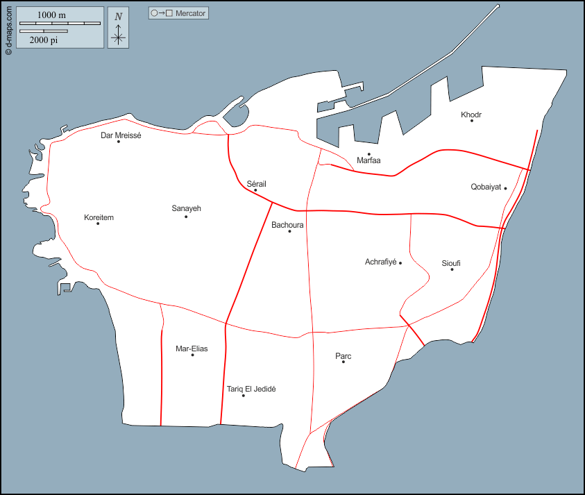 d-maps > एशिया > लेबनान > बेयरूत > बाह्यरेखा, मुख्य शहरों, सड़कों, नाम