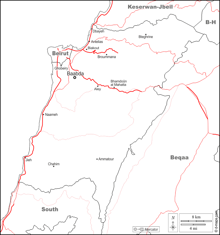 d-maps > एशिया > लेबनान > माउंट लेबनान > सीमाओं, मुख्य शहरों, सड़कों, नाम, सफेद