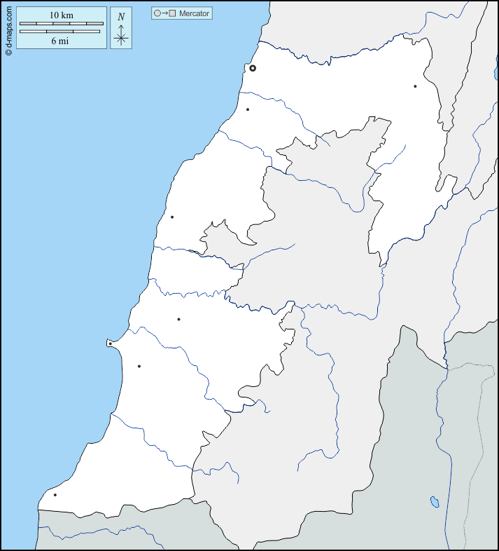 d-maps > एशिया > लेबनान > दक्षिण > सीमाओं, जल-सर्वेक्षण, मुख्य शहरों