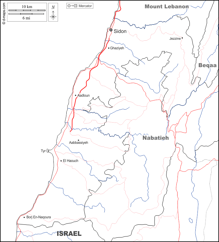 d-maps > एशिया > लेबनान > दक्षिण > सीमाओं, जल-सर्वेक्षण, मुख्य शहरों, सड़कों, नाम, सफेद
