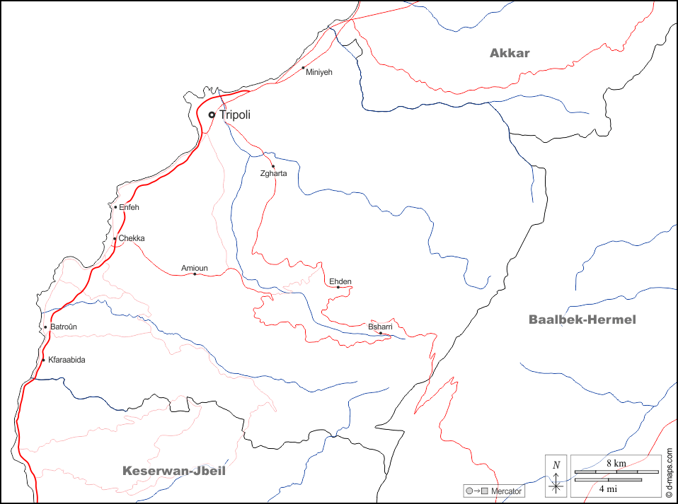 d-maps > एशिया > लेबनान > उत्तर > सीमाओं, जल-सर्वेक्षण, मुख्य शहरों, सड़कों, नाम, सफेद