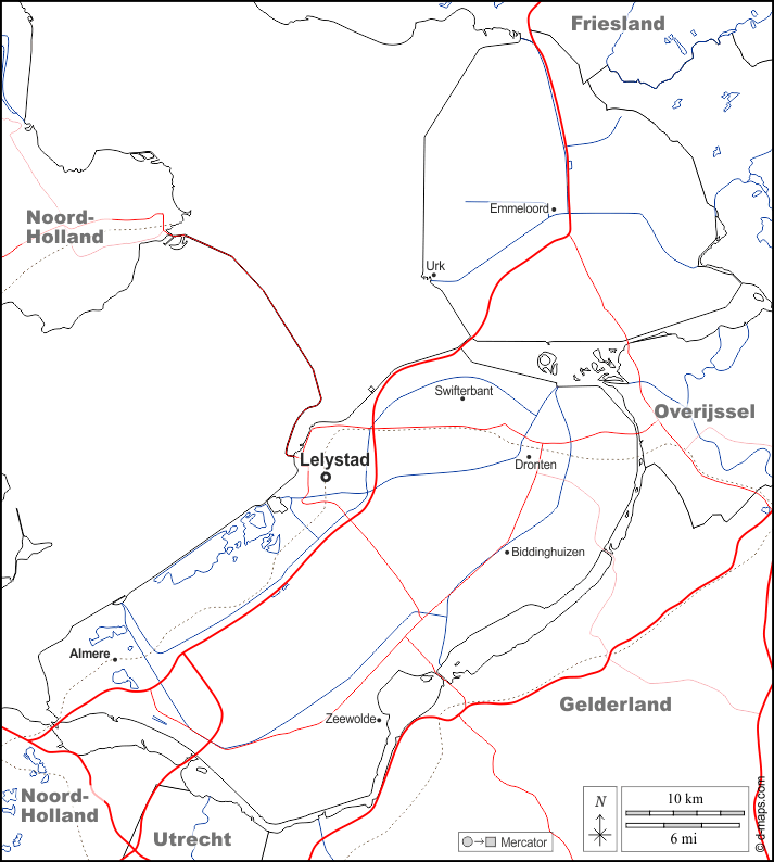 d-maps > यूरोप > नीदरलैंड > फ्लेवोलैंड > सीमाओं, जल-सर्वेक्षण, मुख्य शहरों, सड़कों, नाम, सफेद
