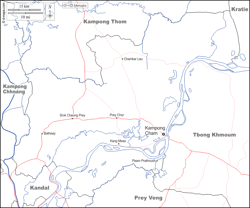 d-maps > एशिया > कंबोडिया > कम्पोंग चाम प्रान्त > सीमाओं, जल-सर्वेक्षण, मुख्य शहरों, सड़कों, नाम, सफेद