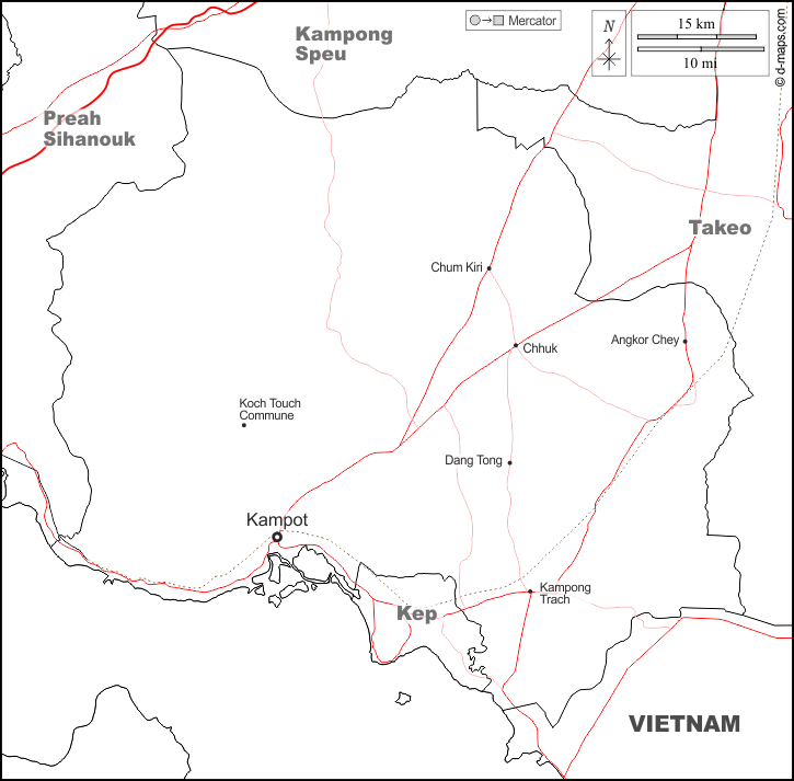 d-maps > एशिया > कंबोडिया > कम्पोत प्रान्त > सीमाओं, मुख्य शहरों, सड़कों, नाम, सफेद