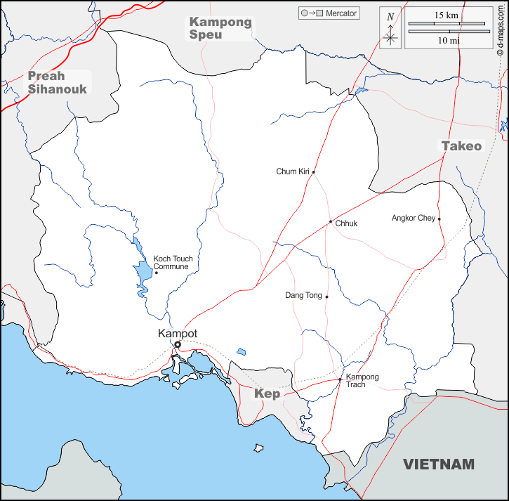 d-maps > एशिया > कंबोडिया > कम्पोत प्रान्त > सीमाओं, जल-सर्वेक्षण, मुख्य शहरों, सड़कों, नाम