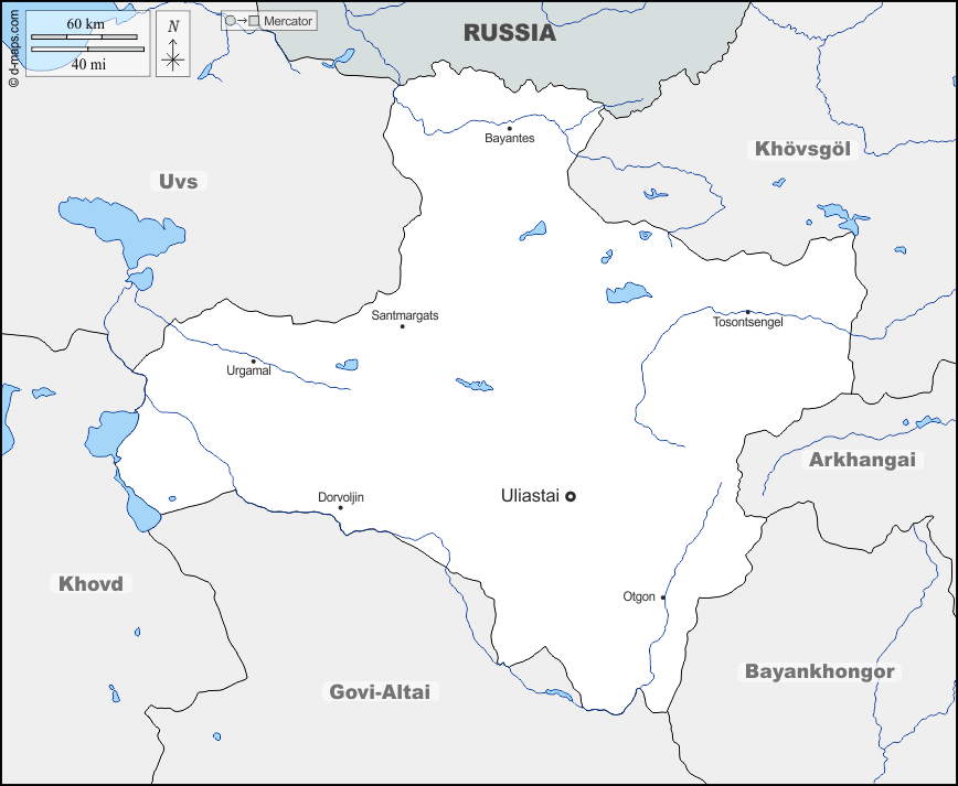 d-maps > एशिया > मंगोलिया > ज़वख़ान प्रांत > सीमाओं, जल-सर्वेक्षण, मुख्य शहरों, नाम