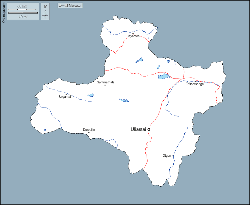 d-maps > एशिया > मंगोलिया > ज़वख़ान प्रांत > बाह्यरेखा, जल-सर्वेक्षण, मुख्य शहरों, सड़कों, नाम