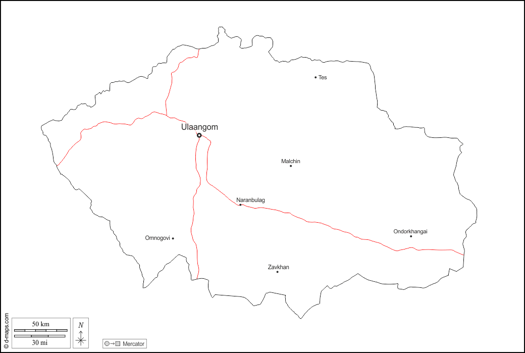 d-maps > एशिया > मंगोलिया > उव्स प्रांत > बाह्यरेखा, मुख्य शहरों, सड़कों, नाम, सफेद