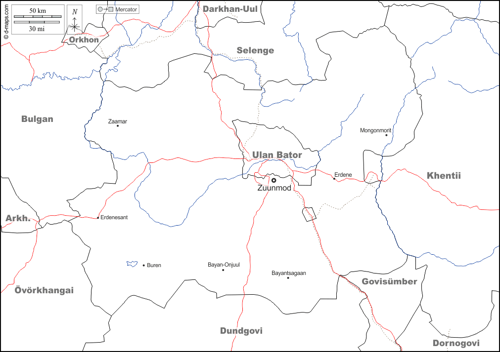 d-maps > एशिया > मंगोलिया > तोव प्रांत > सीमाओं, जल-सर्वेक्षण, मुख्य शहरों, सड़कों, नाम, सफेद