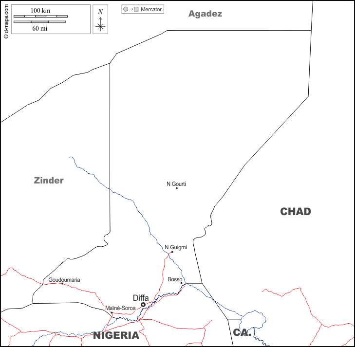 अफ्रीका > नाइजर > डिफ्फा > सीमाओं, जल-सर्वेक्षण, मुख्य शहरों, सड़कों, नाम, सफेद