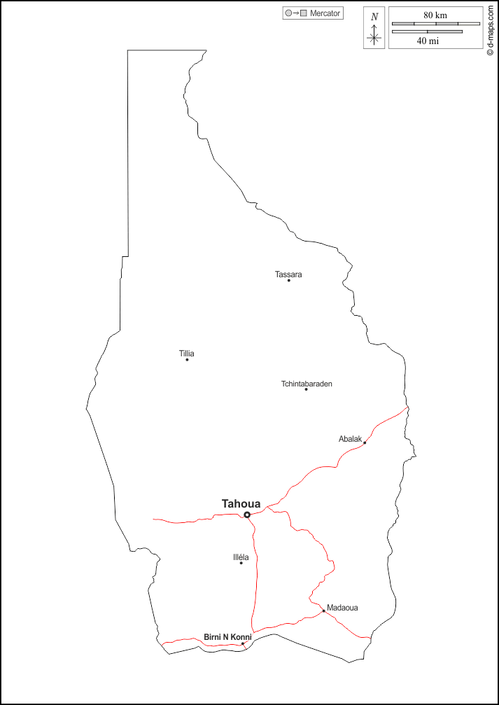 d-maps > अफ्रीका > नाइजर > टाहौआ > बाह्यरेखा, मुख्य शहरों, सड़कों, नाम, सफेद