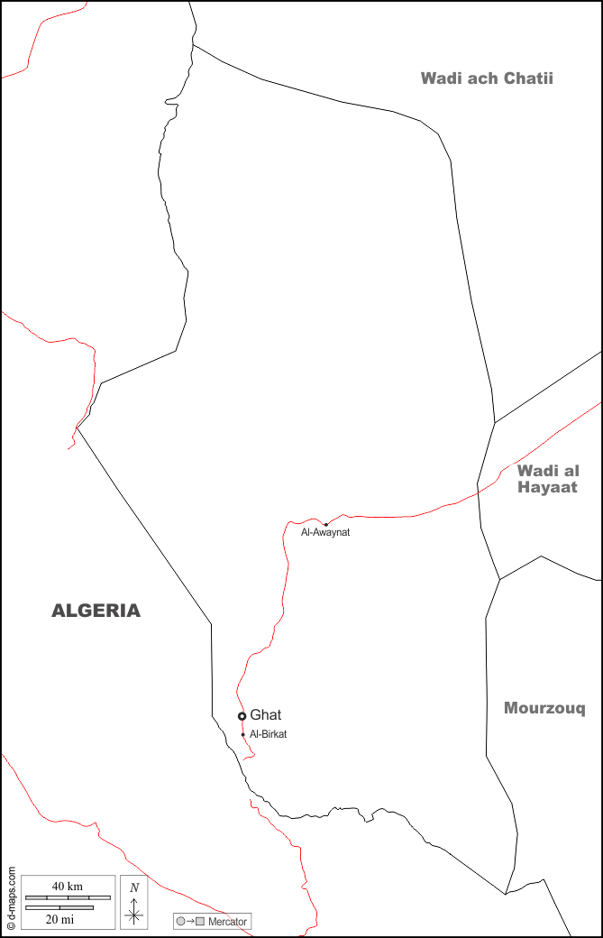 d-maps > अफ्रीका > लीबिया > घाट > सीमाओं, मुख्य शहरों, सड़कों, नाम, सफेद