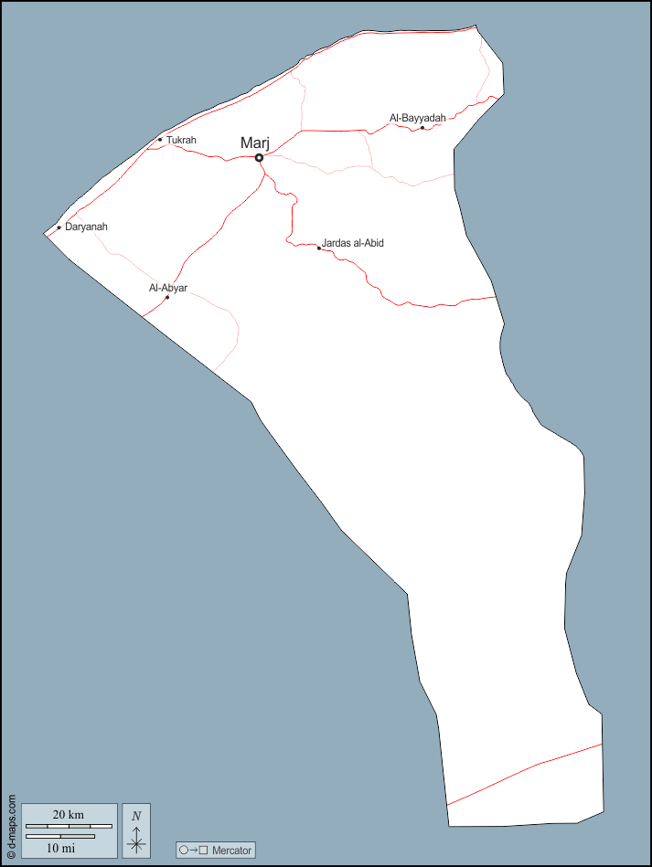 d-maps > अफ्रीका > लीबिया > मर्ज > बाह्यरेखा, मुख्य शहरों, सड़कों, नाम