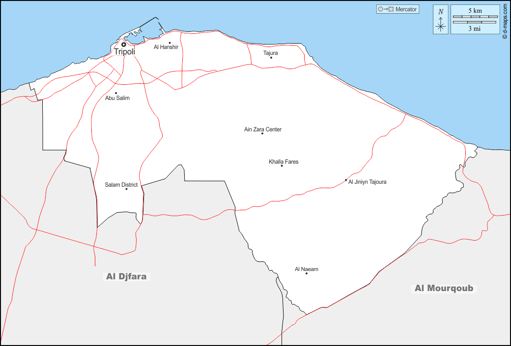 d-maps > अफ्रीका > लीबिया > त्रिपोली > सीमाओं, मुख्य शहरों, सड़कों, नाम