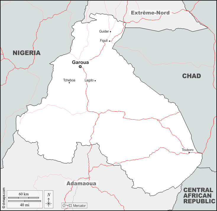 d-maps > अफ्रीका > कैमरून > उत्तर > सीमाओं, मुख्य शहरों, सड़कों, नाम
