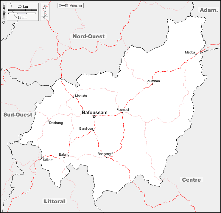 d-maps > अफ्रीका > कैमरून > पश्चिम > सीमाओं, मुख्य शहरों, सड़कों, नाम