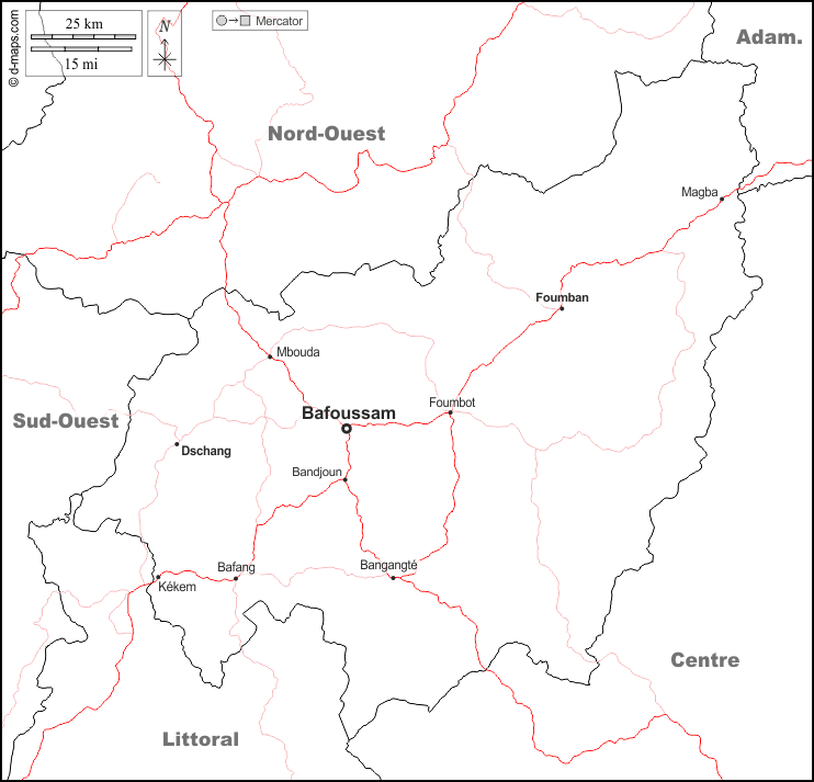 d-maps > अफ्रीका > कैमरून > पश्चिम > सीमाओं, मुख्य शहरों, सड़कों, नाम, सफेद