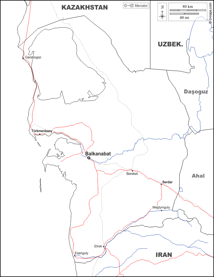 d-maps > एशिया > तुर्कमेनिस्तान > बलक़ान प्रान्त > सीमाओं, जल-सर्वेक्षण, मुख्य शहरों, सड़कों, नाम, सफेद