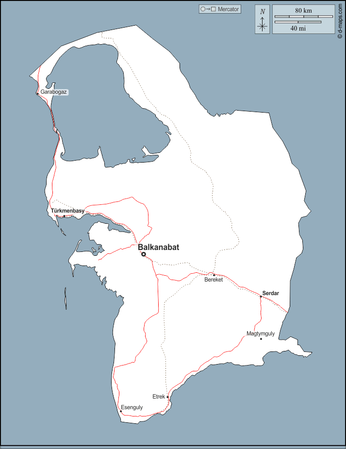 d-maps > एशिया > तुर्कमेनिस्तान > बलक़ान प्रान्त > बाह्यरेखा, मुख्य शहरों, सड़कों, नाम