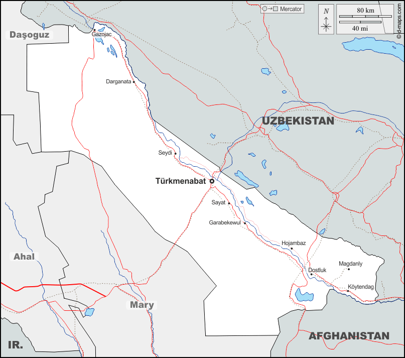 d-maps > एशिया > तुर्कमेनिस्तान > लेबाप प्रान्त > सीमाओं, जल-सर्वेक्षण, मुख्य शहरों, सड़कों, नाम