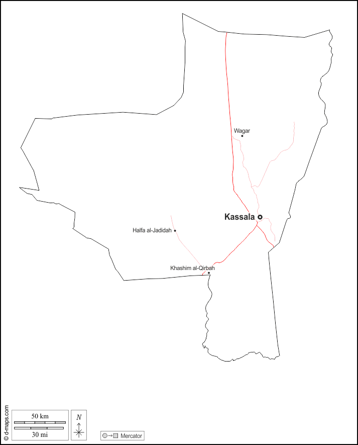 d-maps > अफ्रीका > सूडान > कसाला > बाह्यरेखा, मुख्य शहरों, सड़कों, नाम, सफेद
