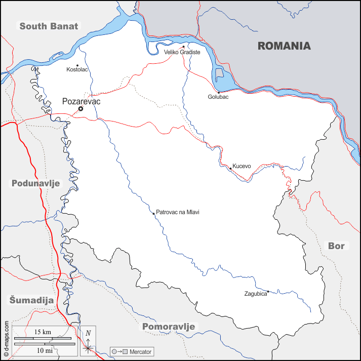 d-maps > यूरोप > सर्बिया > ब्रनिसेवो > सीमाओं, जल-सर्वेक्षण, मुख्य शहरों, सड़कों, नाम
