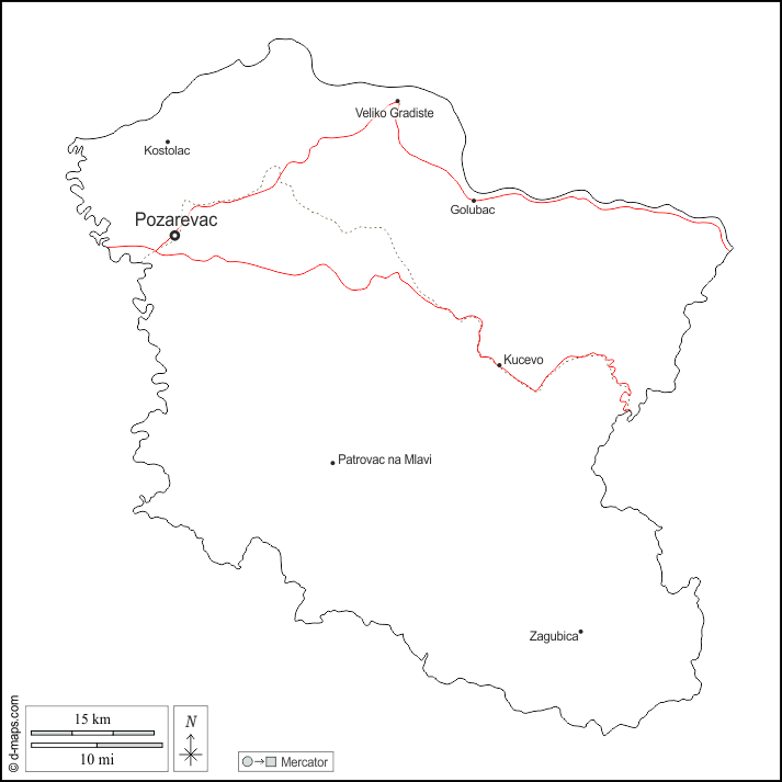 d-maps > यूरोप > सर्बिया > ब्रनिसेवो > बाह्यरेखा, मुख्य शहरों, सड़कों, नाम, सफेद