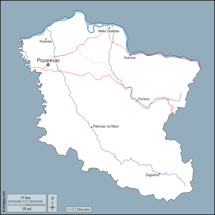 d-maps > यूरोप > सर्बिया > ब्रनिसेवो > बाह्यरेखा, जल-सर्वेक्षण, मुख्य शहरों, सड़कों, नाम