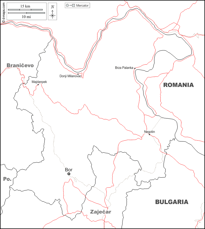 d-maps > यूरोप > सर्बिया > बोर जिला > सीमाओं, मुख्य शहरों, सड़कों, नाम, सफेद