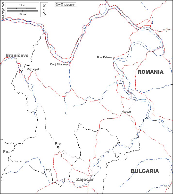 d-maps > यूरोप > सर्बिया > बोर जिला > सीमाओं, जल-सर्वेक्षण, मुख्य शहरों, सड़कों, नाम, सफेद