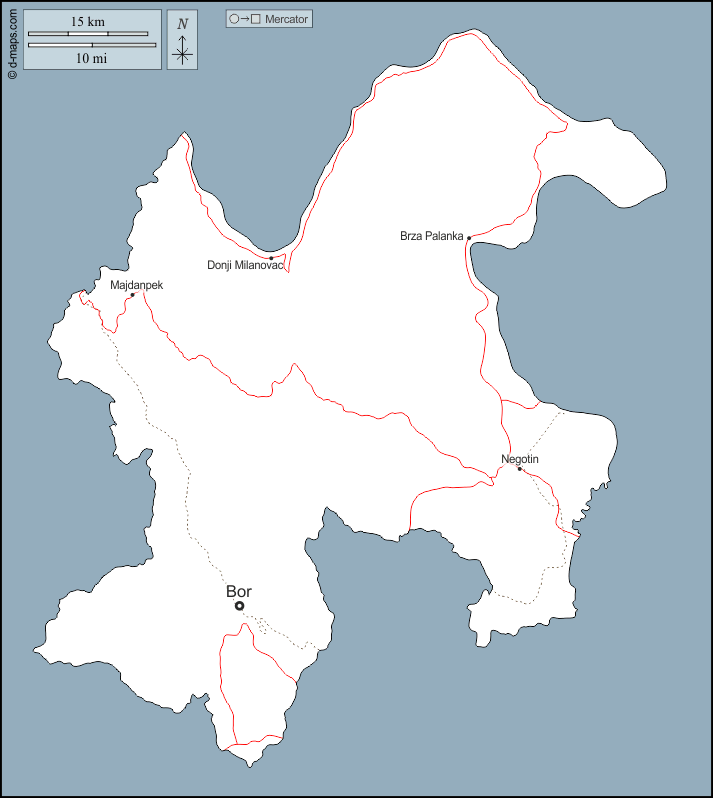 d-maps > यूरोप > सर्बिया > बोर जिला > बाह्यरेखा, मुख्य शहरों, सड़कों, नाम