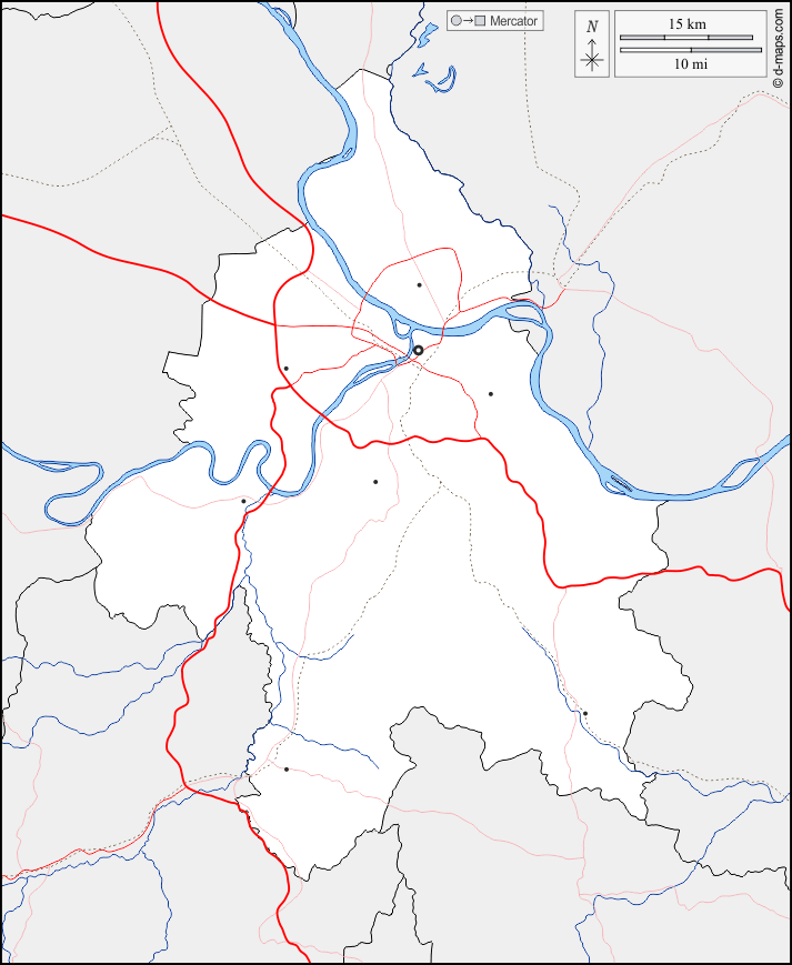 d-maps > यूरोप > सर्बिया > बेलग्रेड > सीमाओं, जल-सर्वेक्षण, मुख्य शहरों, सड़कों