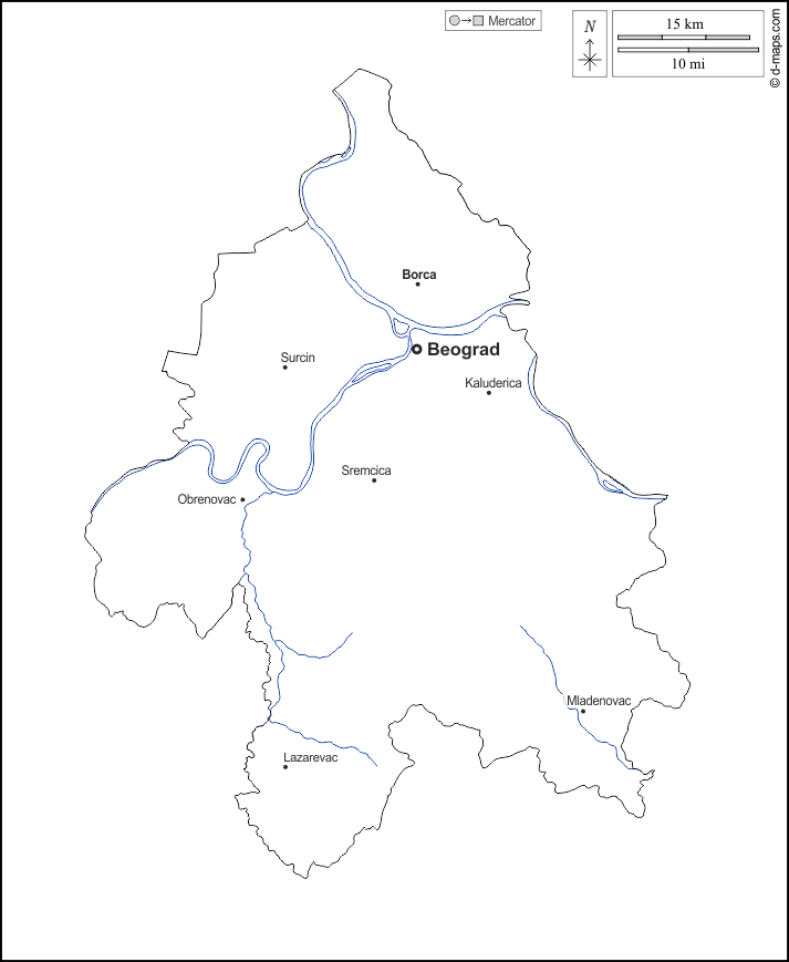 d-maps > यूरोप > सर्बिया > बेलग्रेड > बाह्यरेखा, जल-सर्वेक्षण, मुख्य शहरों, नाम, सफेद