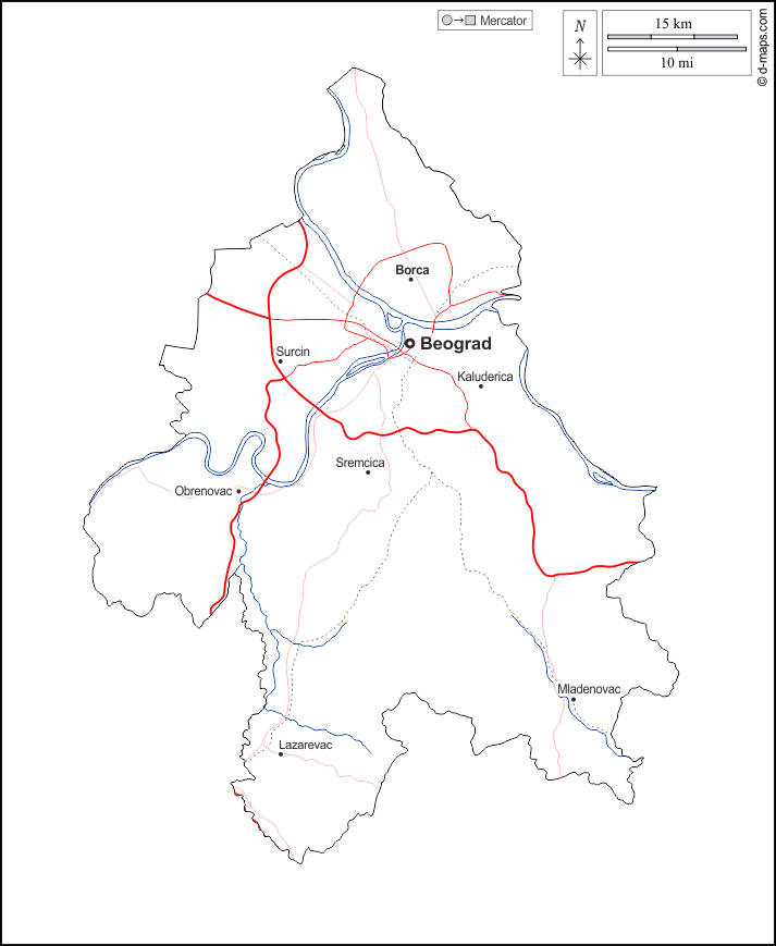 d-maps > यूरोप > सर्बिया > बेलग्रेड > बाह्यरेखा, जल-सर्वेक्षण, मुख्य शहरों, सड़कों, नाम, सफेद