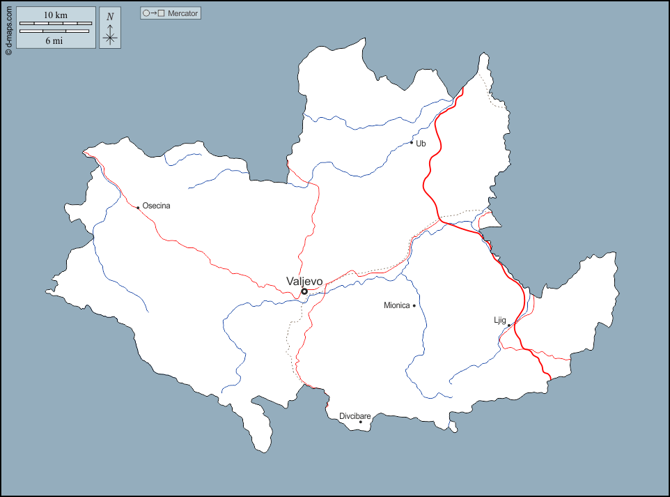 d-maps > यूरोप > सर्बिया > कोलुबारा > बाह्यरेखा, जल-सर्वेक्षण, मुख्य शहरों, सड़कों, नाम