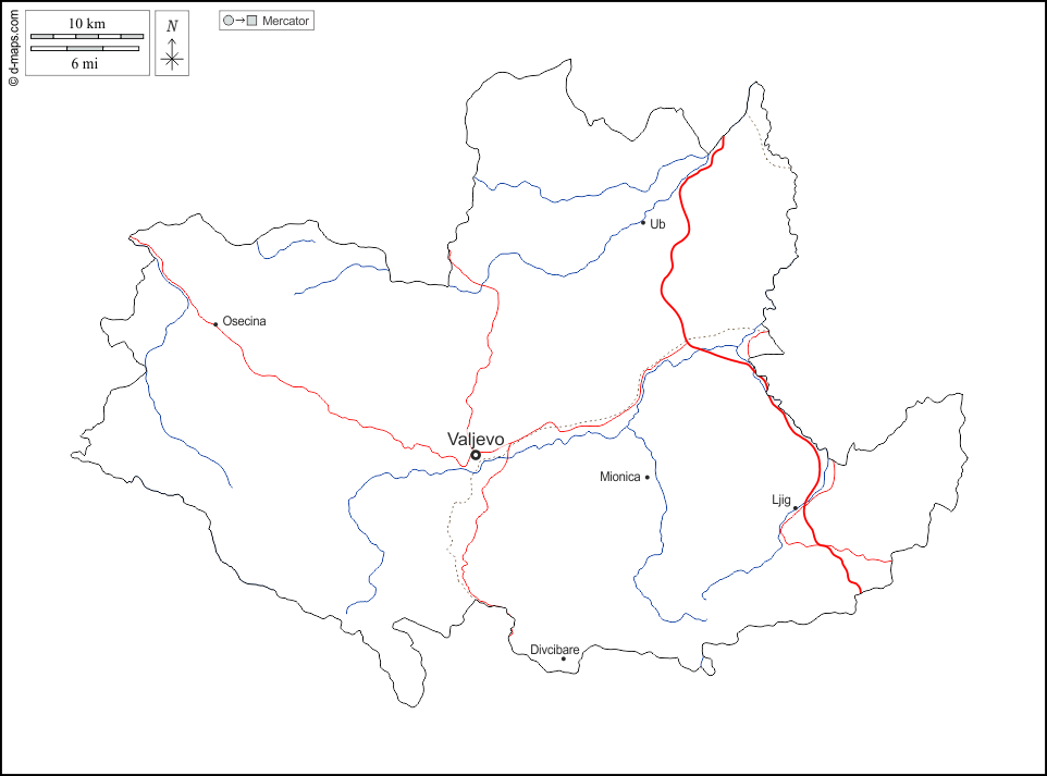 d-maps > यूरोप > सर्बिया > कोलुबारा > बाह्यरेखा, जल-सर्वेक्षण, मुख्य शहरों, सड़कों, नाम, सफेद