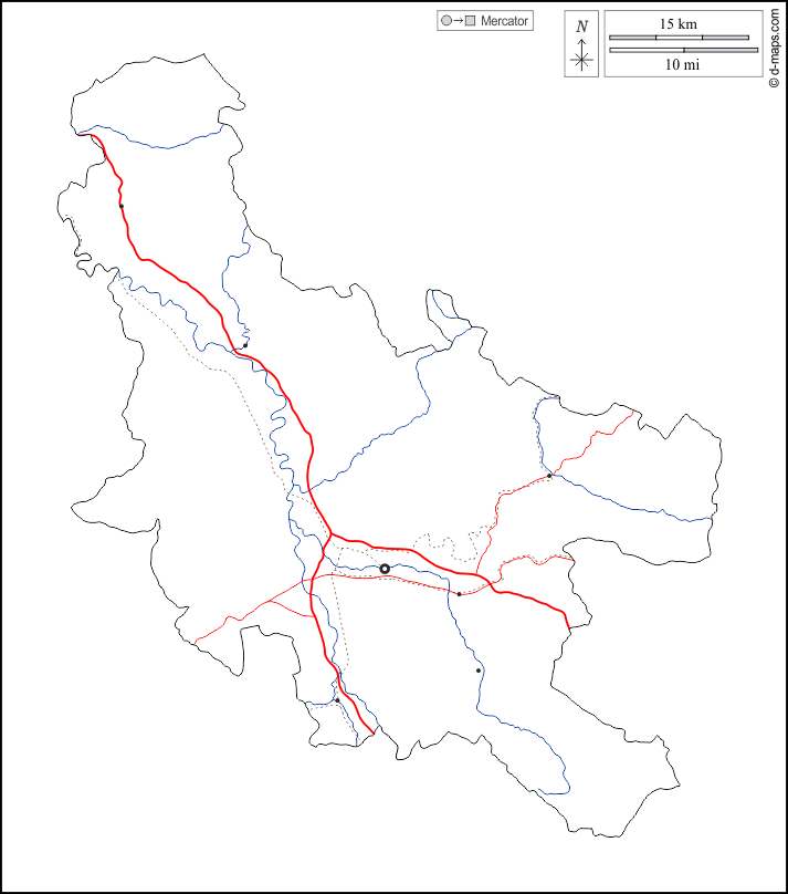 d-maps > यूरोप > सर्बिया > निशावा > बाह्यरेखा, जल-सर्वेक्षण, मुख्य शहरों, सड़कों, सफेद