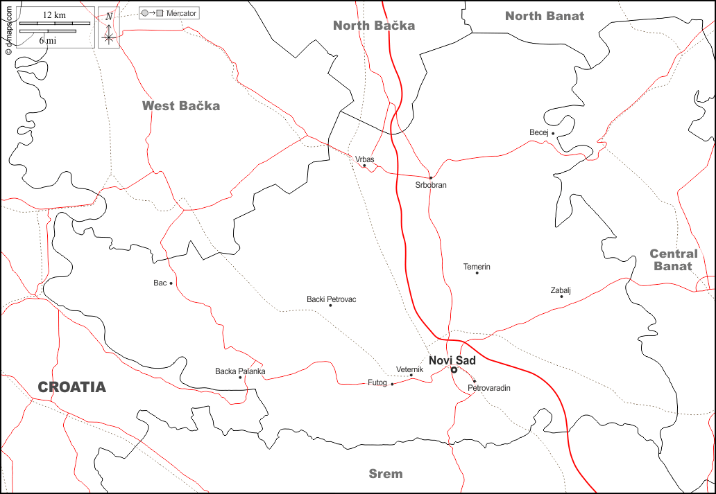 d-maps > यूरोप > सर्बिया > दक्षिण बाक्का > सीमाओं, मुख्य शहरों, सड़कों, नाम, सफेद
