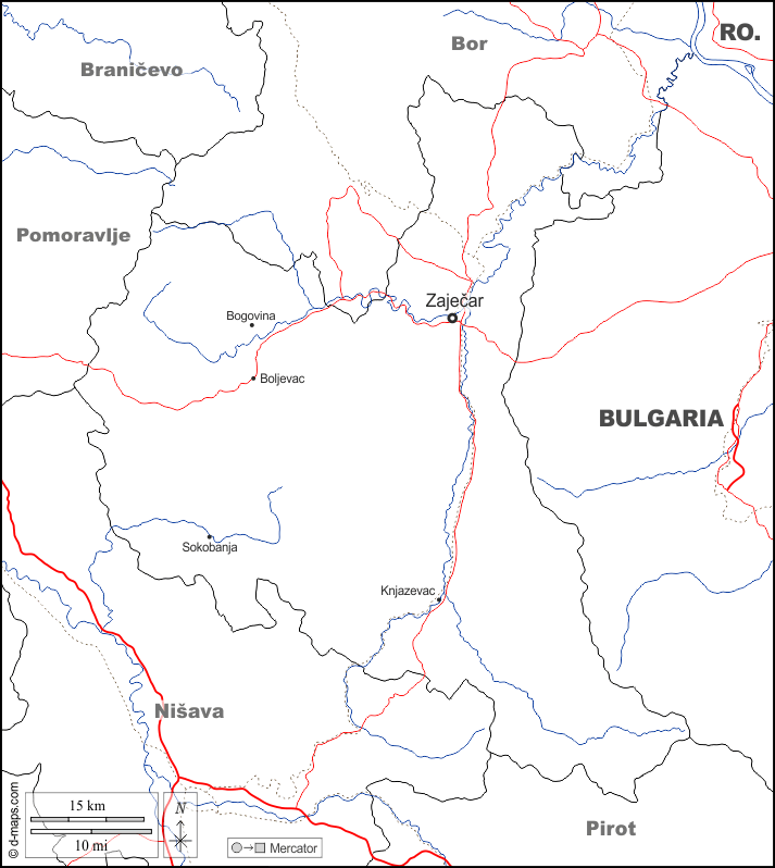 d-maps > यूरोप > सर्बिया > ज़जेकर > सीमाओं, जल-सर्वेक्षण, मुख्य शहरों, सड़कों, नाम, सफेद