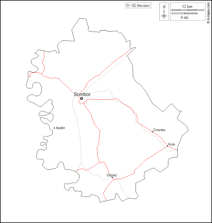 d-maps > यूरोप > सर्बिया > पश्चिमी बाक्का > बाह्यरेखा, मुख्य शहरों, सड़कों, नाम, सफेद