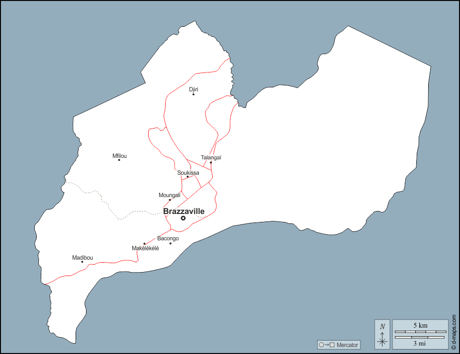 d-maps > अफ्रीका > कांगो > ब्राज़ाविल > बाह्यरेखा, मुख्य शहरों, सड़कों, नाम