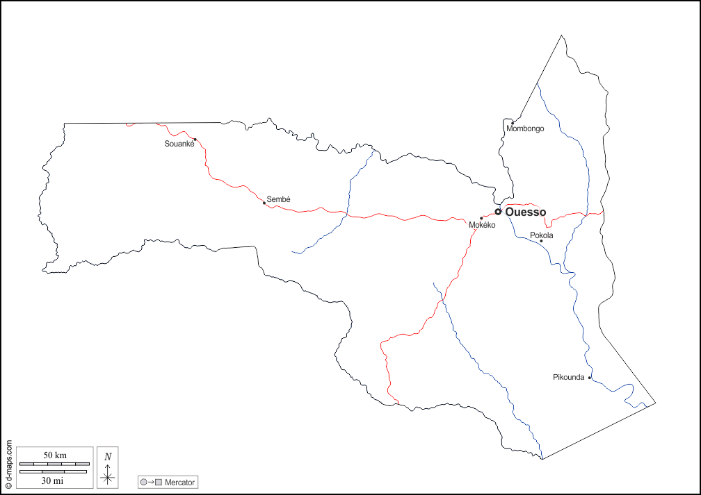 d-maps > अफ्रीका > कांगो > संघ विभाग > बाह्यरेखा, जल-सर्वेक्षण, मुख्य शहरों, सड़कों, नाम, सफेद