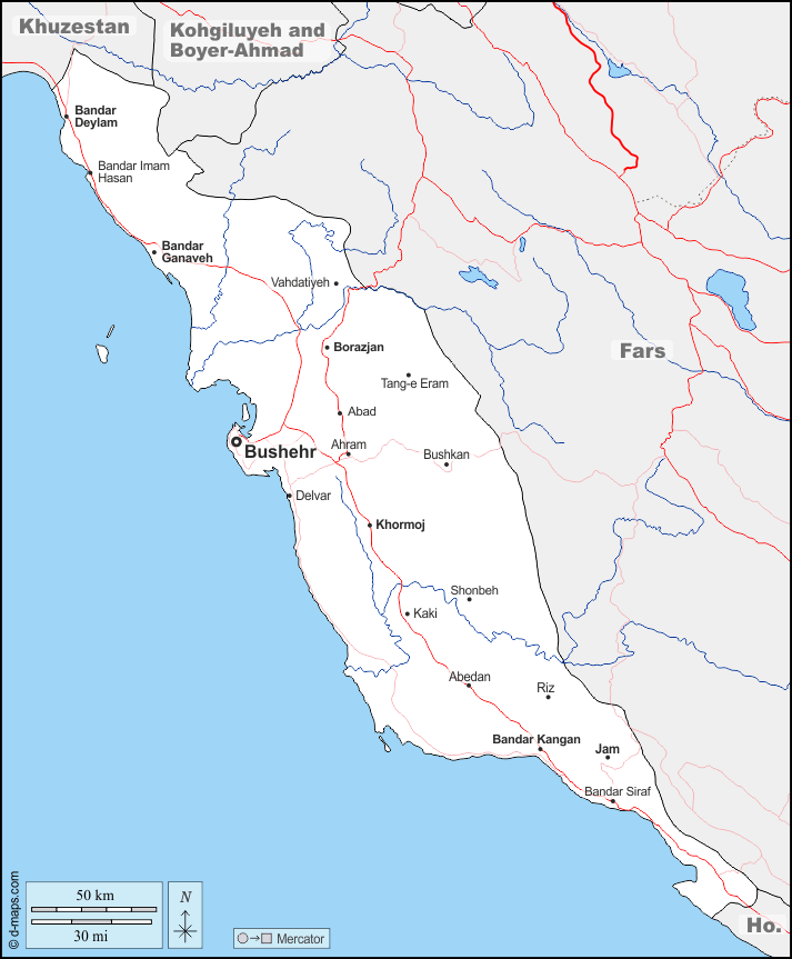 d-maps > एशिया > ईरान > बुशहर प्रांत > सीमाओं, जल-सर्वेक्षण, मुख्य शहरों, सड़कों, नाम